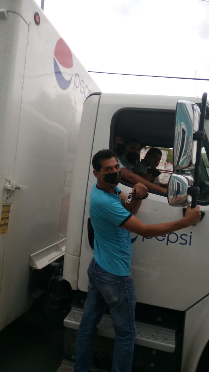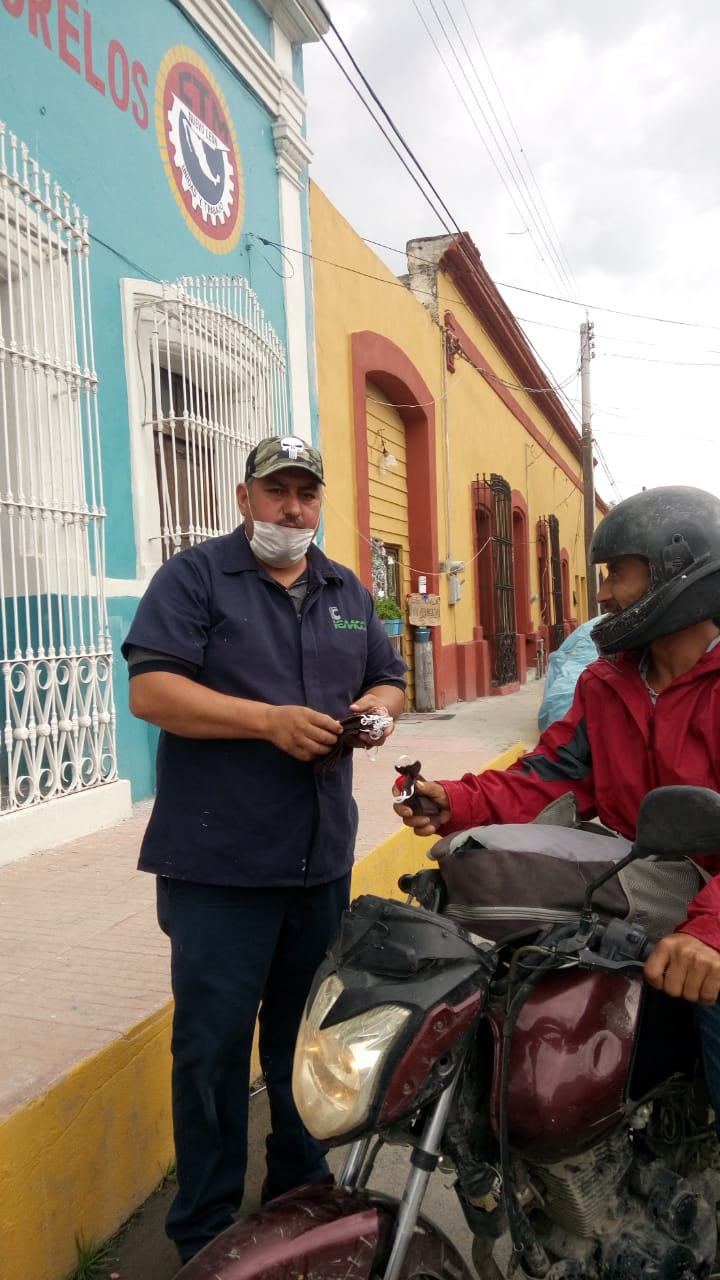 Trabajadores de la industria refresquera, motociclistas, y trabajadores de diversas empresas recibieron de manos de los voluntarios kits de cubrebocas, guantes y gel antibacterial que les ayudarán de cara a la reanudación de labores en sus respectivos trabajos.