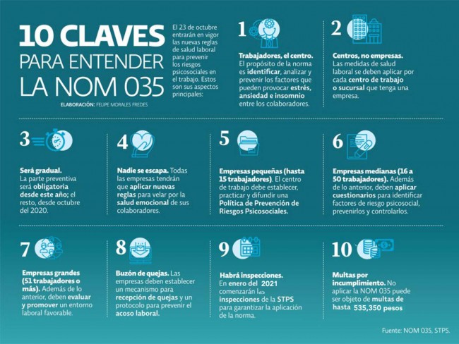 Hoy, 23 de octubre entra en vigor la segunda fase de la NOM 035 y entonces la norma será obligatoria en su totalidad para cada empresa en el país. Desde el año pasado, cuando comenzó la vigencia de la nuevas reglas sobre factores de riesgo psicosociales, los centros de trabajo adquirieron la obligación de implementar acciones preventivas, en un mes, las responsabilidades serán más amplias.